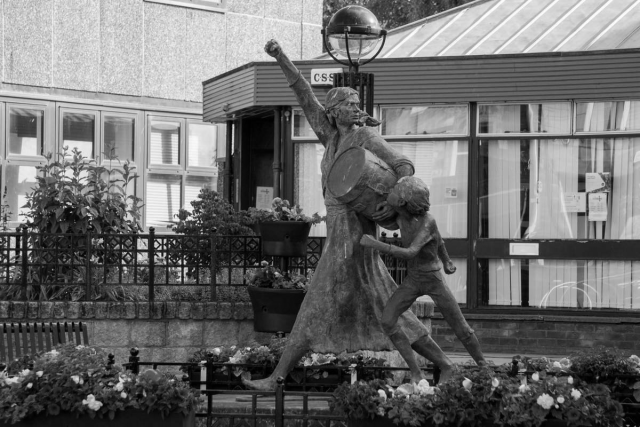“The Massacre of Tranent”, statue by David Annand in Tranent Civic Square. This represents Jackie Crookston, one of those killed during the anti-militia protests, carrying a drum to call out the slogan of “no militia”. Image via ArtUK