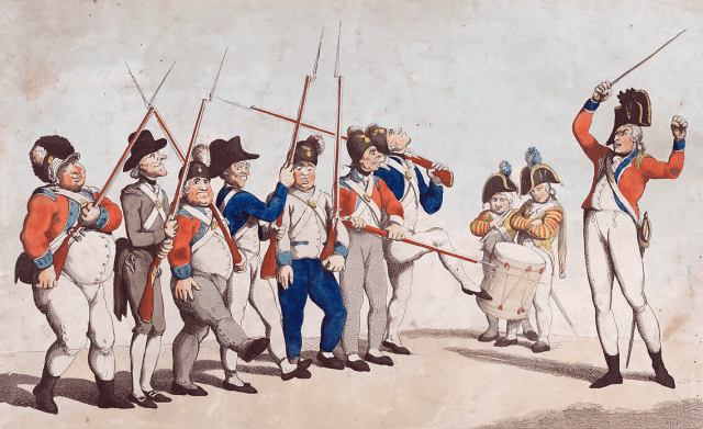 “Light Infantry Volunteers on a March”. 1804 satirical cartoon by Thomas Rowlandson lampooning the physical condition of Volunteer units. Picture via Miesterdrucke.ie