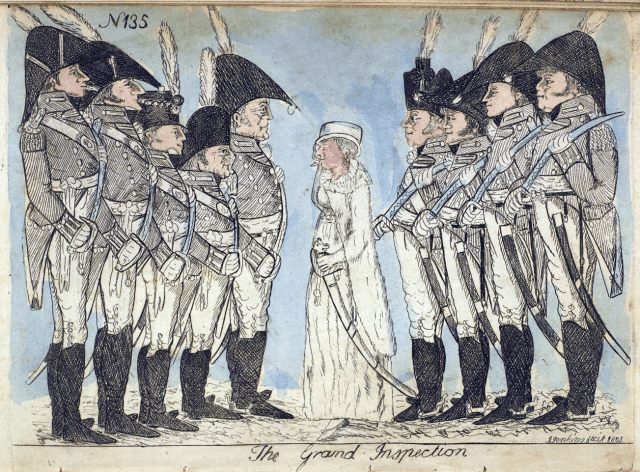 “The Grand Inspection”, caricature satirising Edinburgh volunteer officers being inspected by a lady; the inference being their patriotic service can be reduced to dressing up for her approval. By J. Jenkin, 1805. National Library of Scotland.