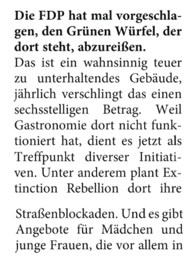 Da wir eine stetige Stimme gegen #FakeNews in #Bielefeld sein wollen, müssen wir der #fdp Kandidatin Jasmin Wahl-Schwentker und der #nw die offensichtilich keinen Faktencheck in Interviews machen wiedesprechen. Wir Plannen unsere Straßenblockaden nicht im #GrünenWürfel unser Plenum findet jeden Mittwoch um 19:00 Uhr in der Wandelmühle statt. (Aber heute sind viele von uns tatsächlich im Grünen Würfel zur Pediumsdiskusion der #BUNDjugend )