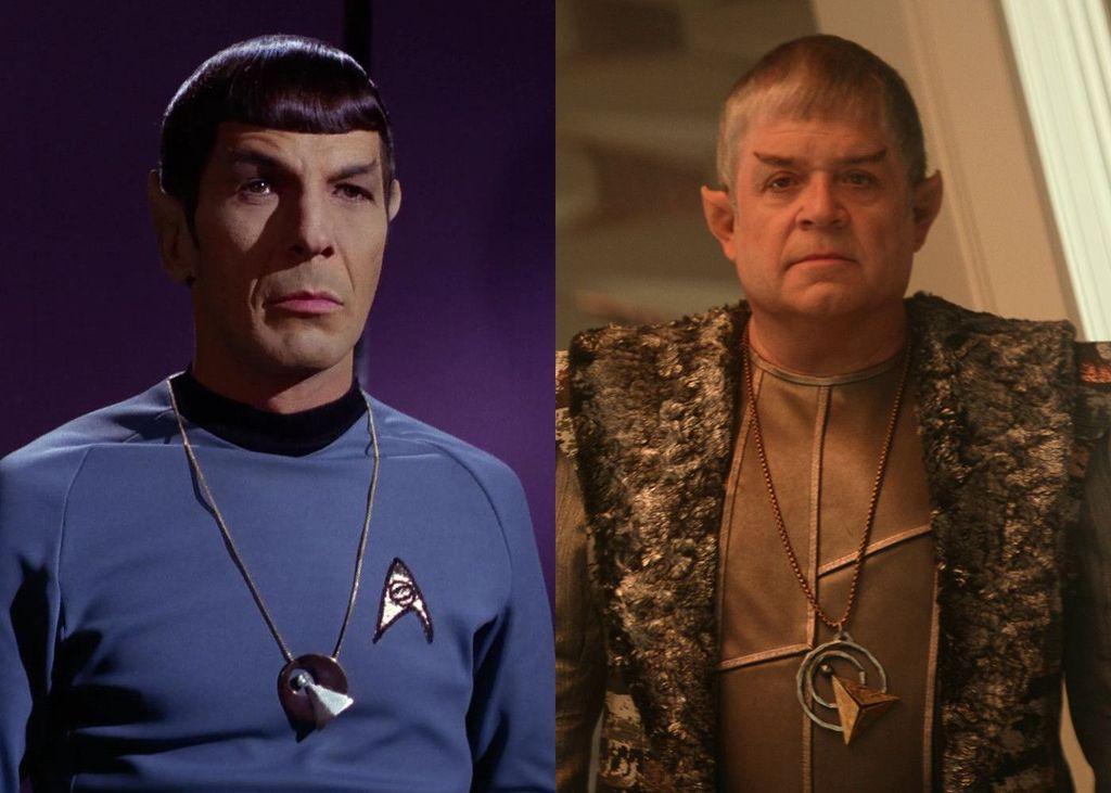 Here are both Spock (#StarTrekTOS' "Is There in Truth No Beauty?"⬅️) and Doug (#StarTrekSNW's "Four-and-a-Half Vulcans"➡️) wearing necklaces with Vulcan IDIC pendants. 🖖