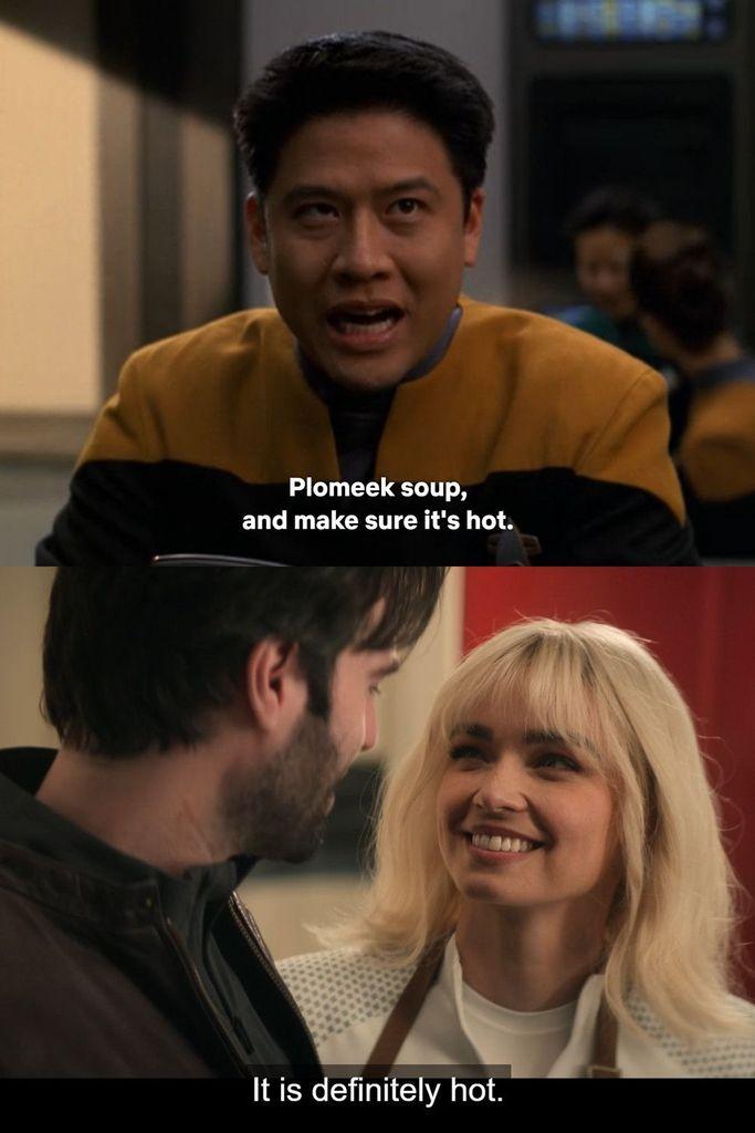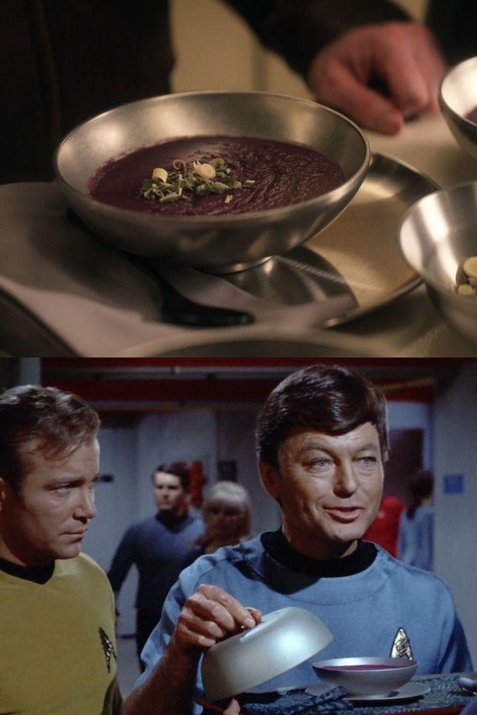 #StarTrekSNW's "Four-and-a-Half Vulcans"⬆️ we finally saw wonderfully purple Vulcan plomeek soup again, similar to the onw (and served in the same kind of bowl and plate) as the one seen in #StarTrekTOS' "Amok Time"⬇️, Both times, the soup was cooked by Nurse Chapel. :-)