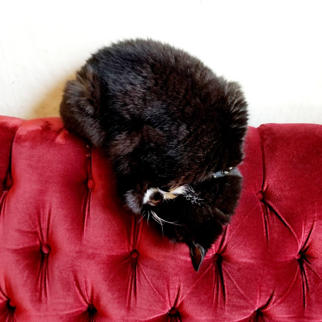 My friend sent me a photo of her black tuxedo #cat - totally zonkered out atop a couch. It looks like she's gonna topple over but she's been there for 2 hours like that - kitty snores n all 😹