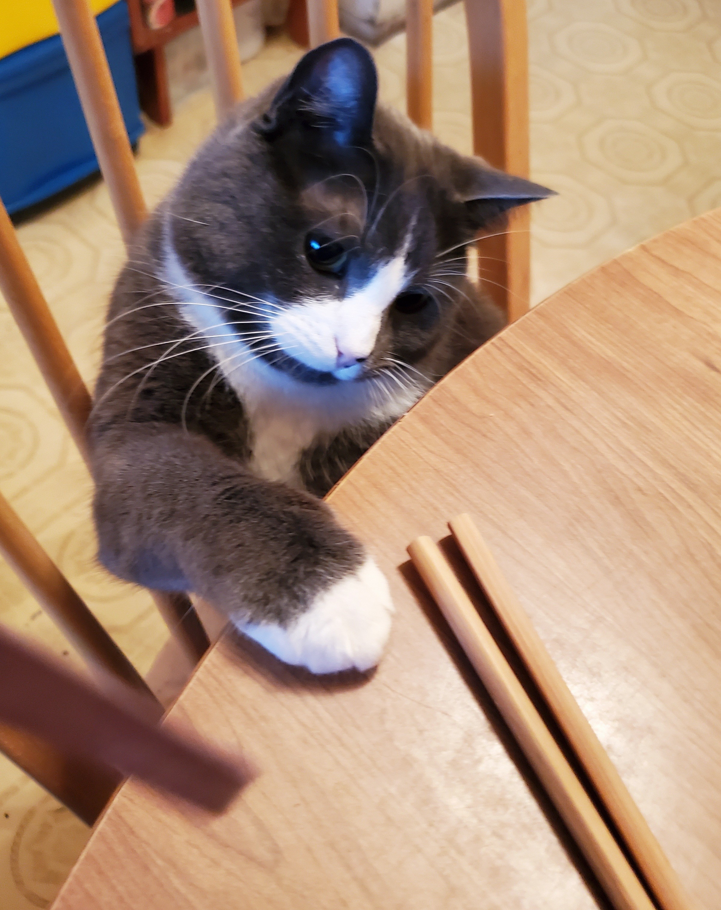 Grateful for Asher every day. Especially on days I feel gloomy and he still can make me smile & laugh by being his goofy little cat self. He was playing with my chopsticks while I was getting ready to eat noodles.