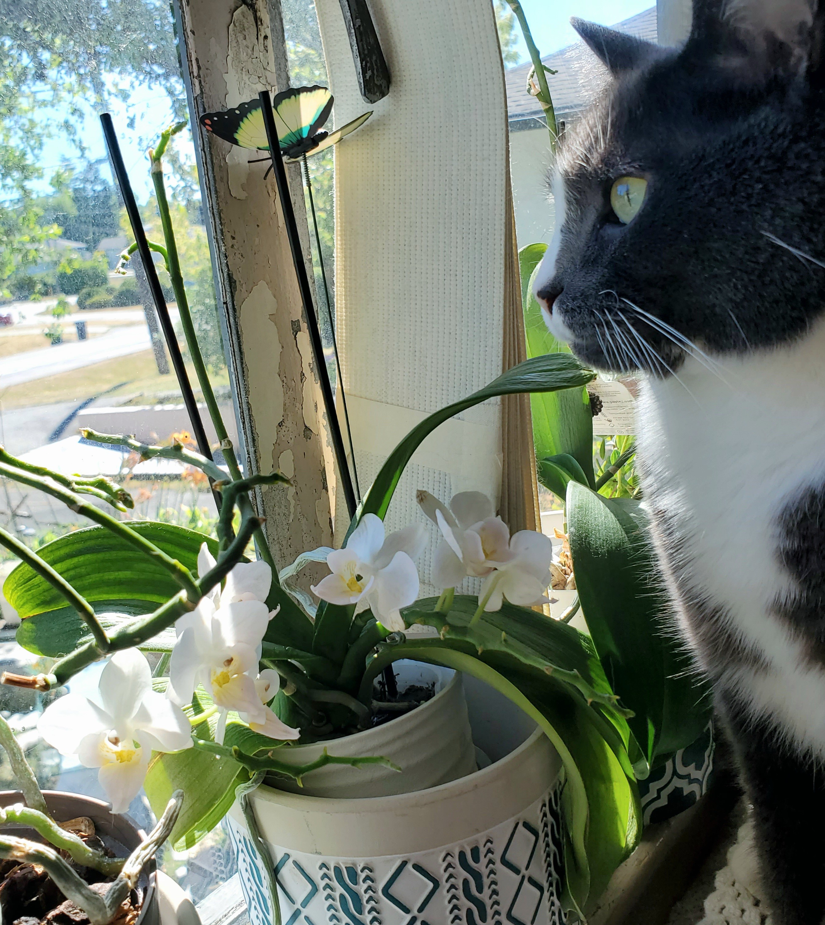 Asher is watching morning birds & invasive ground lizards traffic, through the front window.