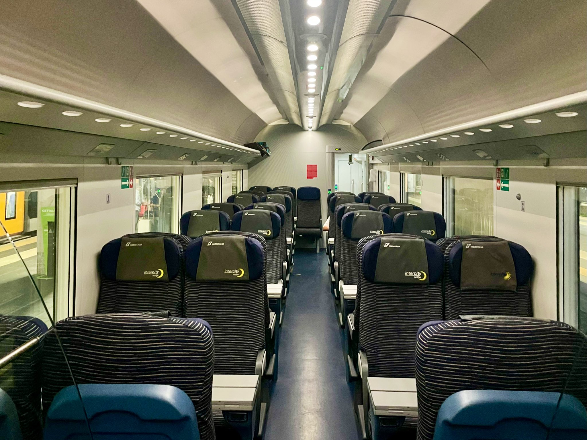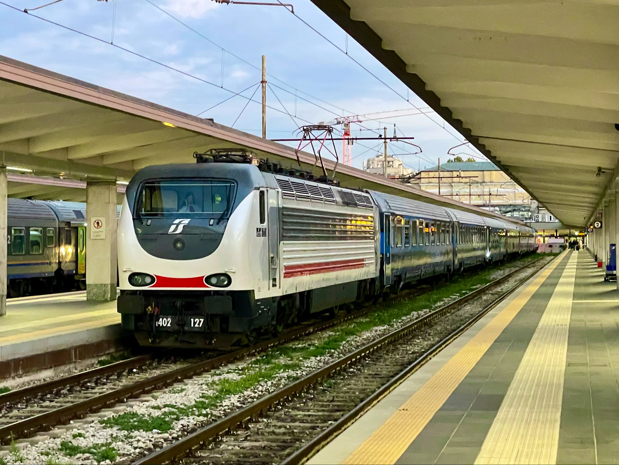 Tonight’s #Trenitalia 🇮🇹 #InterCityNotte #770 from #Trieste is hauled, top’n’tail, by Class E.402B electrics. It includes ex-Z1 1st and 2nd class cars, and an ex “Gran Confort” one, all rebuilt to 2+2 open plan seating. Plus a T3 (ex-T2s) sleeper and two T4 couchettes (ex UIC-X 1st class compartment seaters).