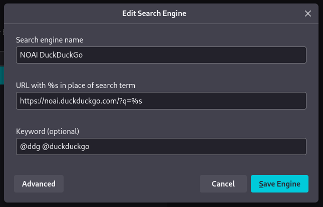 I fought with firefox for way to long to figure this shit out, so here's the configuration for usng the noai version of DuckDuckGo as a search provider option: